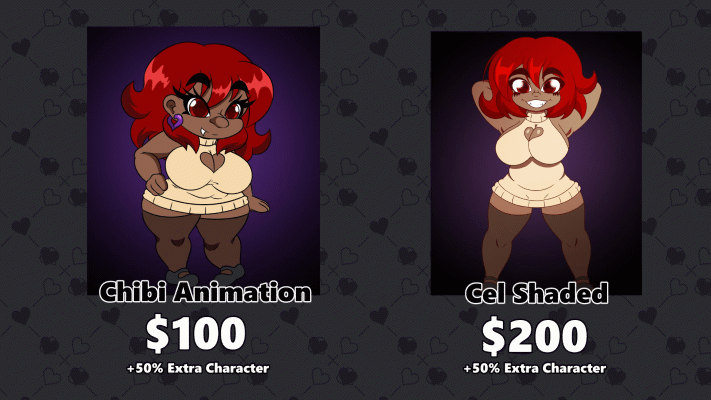 -Character traits (horns, tails, skin marks, etc....) will be respected at no additional cost, however in the case it may not be compatible with the base animation it may add extra cost to change.